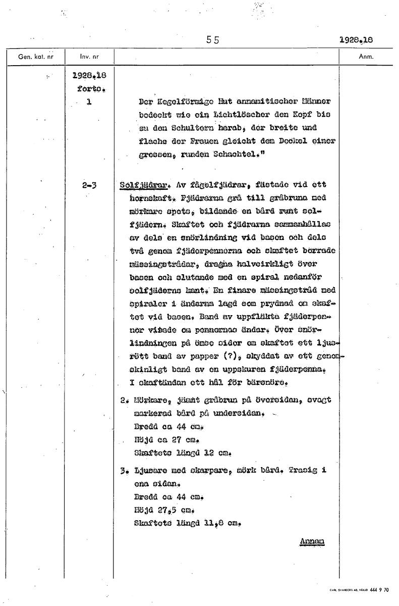 5 5 1926.16 1926.16 forte. DerKogeltörmige Hut annamitiocher Danner ode ht wie olu Lichtlöscher den Sept bio eu don Schultera'horabo der breite und nach° der Prauen aleicht dem Dockel pinor Creppene randen Schaehtelf," 2.3 2.4Tädaro Av tågeltjädrar, täotade vid ett hornekaft!k Pågararna arå till gråbruna ned mörkare spöt% bildande, on bård runt 001. tjädern4 Skaftet och tjädrarna pannanbållac ov delo en onörlindning vid bacon och delo två genom tjädorponnerna och okattet berrado märmingotrådar, dragna halvcirkliet över basen och olutonde ned en spiral nedantör ooltjäderno 1ant4; In finare mäeolnaotråd med Ppiroler i ändarna lagd som prydnad on okat tet Vid bacon. Band av ~flukta fjåderlow,4 nor vitade am pennernae ändar över anör- lindningen på oidor om skattat ett 'jun rött band av papper (?), okddat av ett gen okinligt band av on uppokuron tJäderPonnat 1 okattändan ett bål tör bäronört. 2. Mörkare, jämnt gråbrun På övereidan9 Ovaat markerad bård på underoidan. - Bredd ca 44 cm. Höjd ca 27 en. Skatat° längd 12 en. 3 IdueOre ned okarParep mörk bard, Tramig i ona oidan9 Bredd ca 44 cm. kiöjd 270 044 Skaftets:j längd 11-6 on. Annan [ocr]Stäng