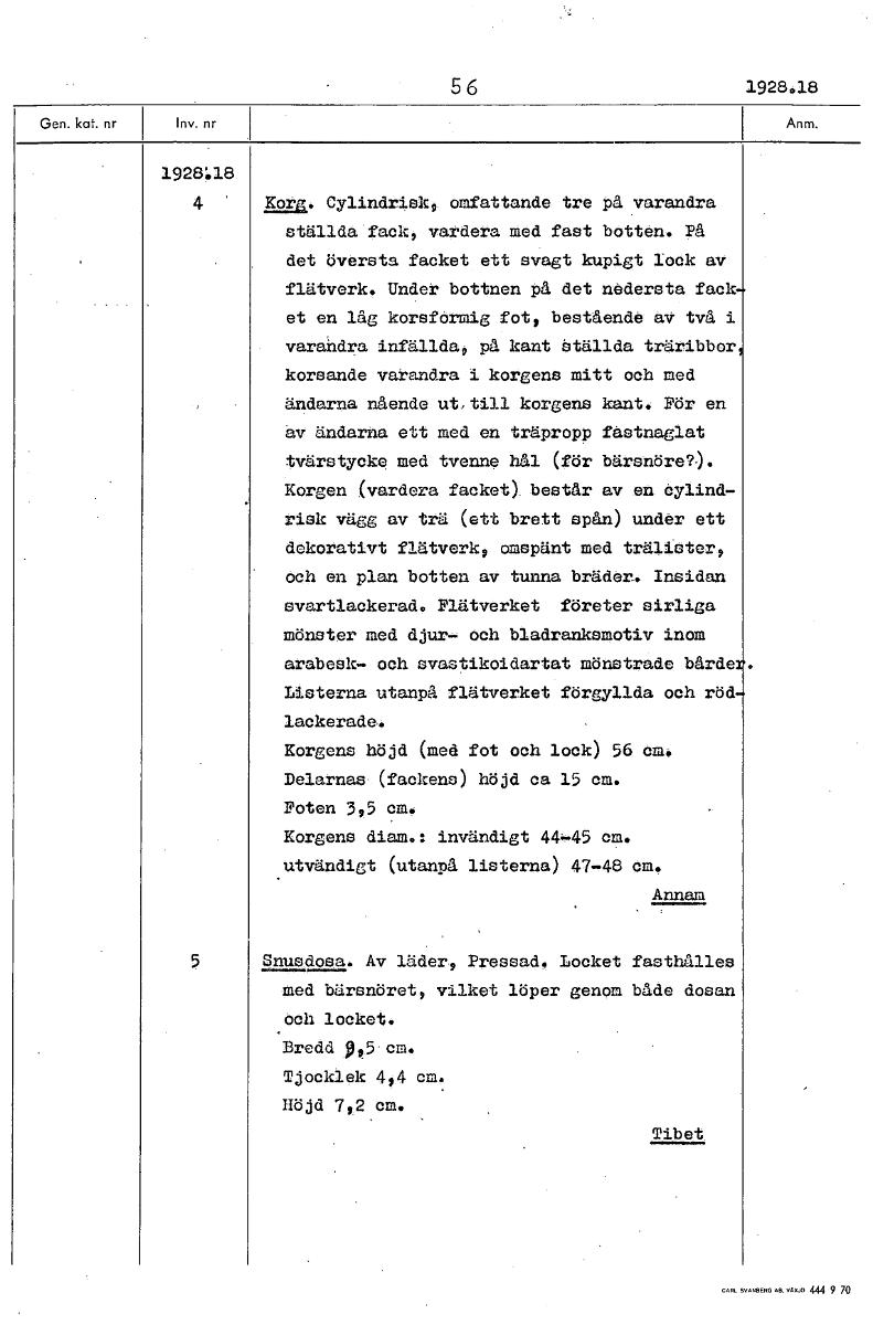 5 6 1928.18 1928:18 4 ' 31w Cylindrisk, omfattande tre på varandra ställda fack, vardera med fast botten. På det översta facket ett svagt kupigt lock av flätverk. Under bottnen på det nedersta fack et...
