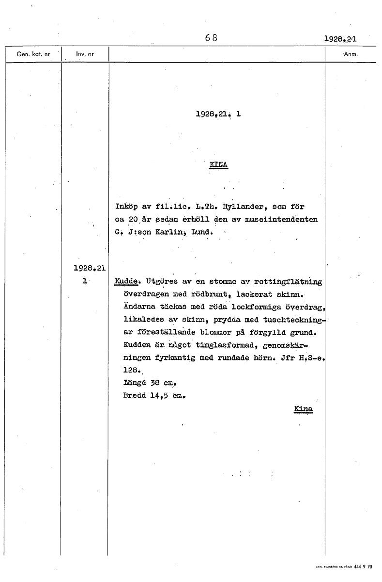 68 1928, 1928,21;, 1 KINA Inköp av fil.lic. L.Th. Hy1lander, som för ca 20 år sedan erhöll den av muzeiintendenten G. J:son Karlin, Lund. 1928.21 1. Kudde. Utgöres av en stomme av rottingflätning överdragen med rödbrunt, lackerat skinn. Ändarna täckas med röda lockformiga överdrag likaledes av skinn, prydda med tuschteCkning ar föreställande blommor på förgylld grund. Kudden är någoftimglasformad, genomskär- ningen fyrkantig med rundade hörn. Jfr H.S-e 128., Längd 38 cm. Bredd 1445 cm. Kina [ocr]