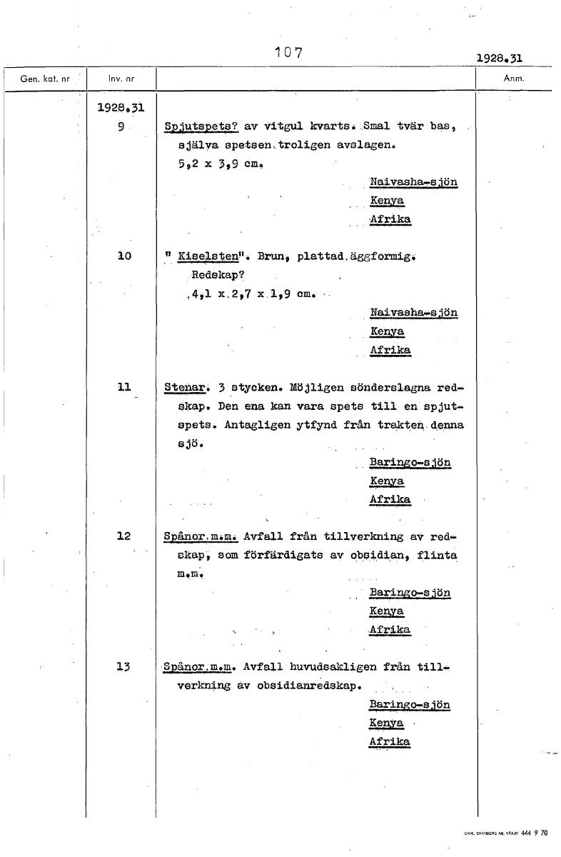 107 1928.31 1928931 9 Spjutspets? av vitgul kvarts.Smal tvär bas, själva spetsen,troligen avslagen, 5,2 x 3,9 em. Naivasha-sjön Kenya Afrika 10 "Kiselsten". Brun, plattad.äggformig. Redskap? ,41 x,2,7 x.]1 9 cm. Naivasha-sjön Kenya Afrika 11 Stenar. 3 stycken. Möjligen sönderslagna red,. Skap, Den ena kan vara spets till en spjut.. spets. Antagligen ytfynd från trakteM.denna sjö. Baringo-sjön Kenya Afrika 12 Spånor.m.m. Avfall från tillverkning av red- skap, som förfärdigats av obsidian, flinta Baringo-sjön Kenya Afrika 13 Spånor.m.m. Avfall huvudsakligen från tillverkning av obsidianredskap. Baringo-slön Kenya Afrika [ocr]