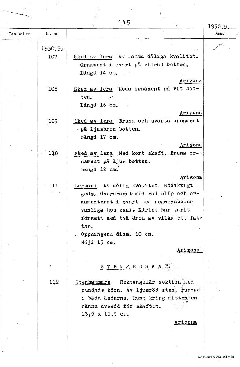 • 145 1930.9. 1930.9:: 107 Sked av lera Av samma dåliga kvalitet# Ornament i svart på vitröd botten. Längd 14 cm, Arizona 108 Sked av lera Röda ornament på vit bot- ten. --- Längd 16 cm. Arizona 109 Ske... Visa hela