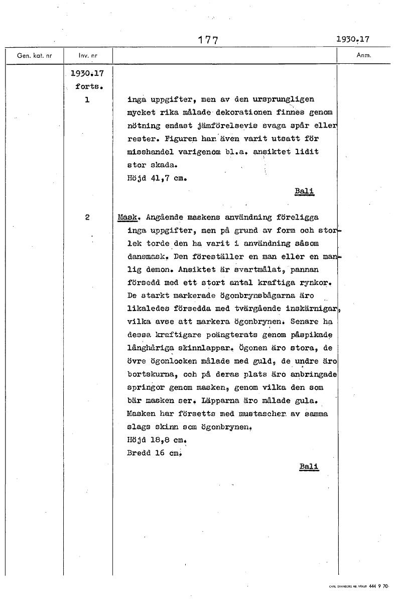 177 1930.17 .1930.17 forts» 1 inga uppgifter, men av den ursprungligen mycket rika målade dekorationen finnes genom nötning endast jämförelsevis svaga spår elle rester. Figuren har'även varit utsatt för misshandel varigenom bl.a. ansiktet lidit stor skada. Höjd 41,7 cm. Bali 2 Mask. Angående mäskens användning föreligga inga uppgifter, men på grund av form och sto lek torde den ha varit i användning såsom dansmask. Den föreställer en man eller en ma lig demon. Ansiktet är svartmålat, pannan försedd med ett stort antal kraftiga rynkor. De starkt markerade ögonbrynsbågarna äro likaledes försedda med tvärgående inskärnigar vilka avse att markera ögonbrynen. Senare ha dessa kraftigare poängterats genom påspikade långhåriga skinnlappar._ ögonen äro stora, de övre ögonlocken målade med guld, de undre äro bortskurna, och på deras plats ärt) anbringade springer genom masken, genom vilka den som bär masken ser. Läpparna äro målade gula. Masken har försetts med mustaächer av samma slags skinn som ögonbrynen. Höjd 18,8 cm. Bredd 16 Cm. Bali [ocr]