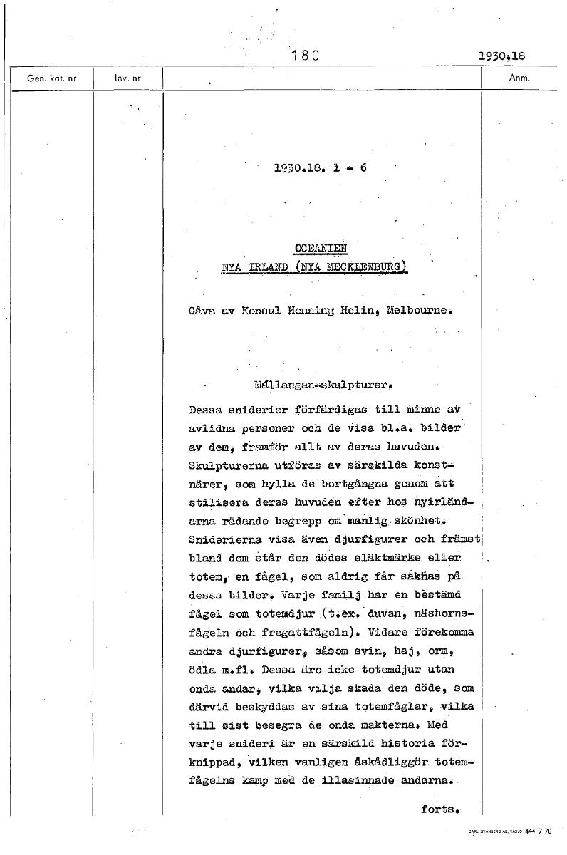 180 193048 ' 1930.18. 1 - 6 OCEANIEå NYA IRLAND NYA MECKLENBURG) Gåva av Konsul Henning Helin, Melbourne. M411angan-skulpturer. Dessa sniderier förfärdigas till minne av avlidna personer och de visa b...