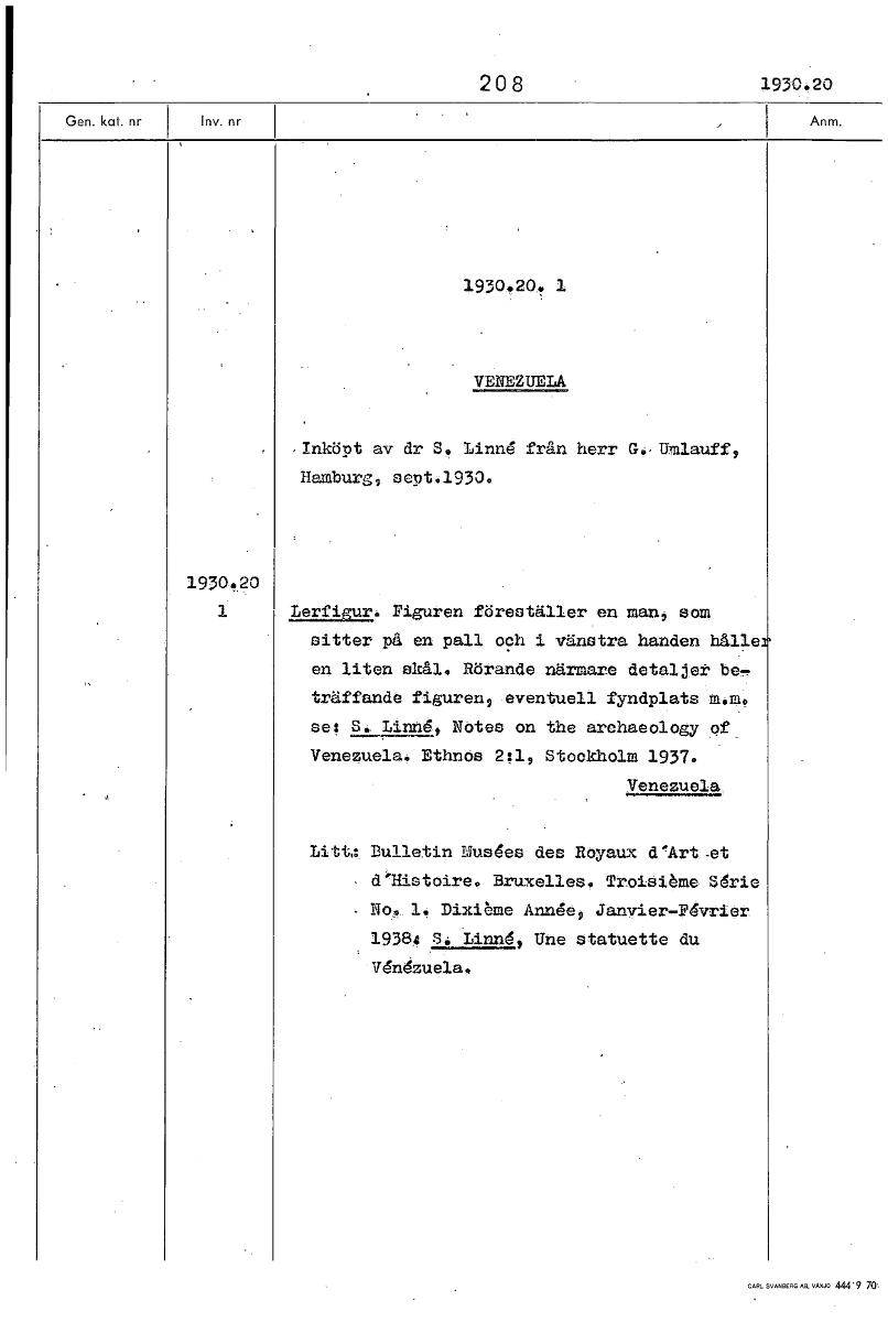 208 1930,20, 1 VENEZUELA ,Inköpt av dr 5. Linne från herr G0.Umlauff, Hamburg, sept.1930. 1930,?0 1 Lerfigur. Figuren föreställer en man, som sitter på en pall och i vänstra handen hålle en liten skål. Rörande närmare detaljer be träffande figuren, eventuell fyndplats m.m se: S.. Linne, Notes on the archaeology of Venezuela: EthnOs 24, Stockholm 1937. Venezuela, Litt. Bulletin Musees des Royaux d'Art-et d'Histoire. Bruxelleså Troisibme Uris No, 1. Dixibme Anne, Janvier-F6vrier 19384 Så Idnnd, Une statuette du Undzuela. [ocr]