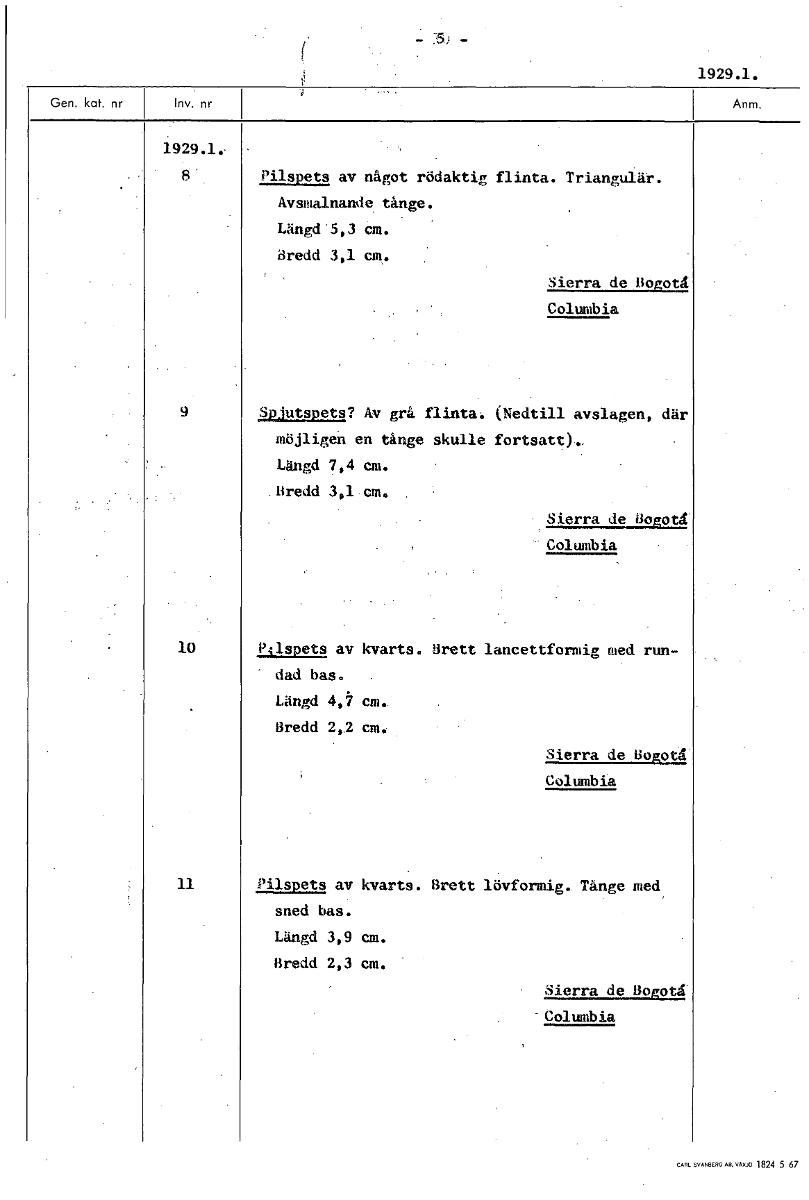 1929.1. 1929.1.- 8 Pilspets av något rödaktig flinta. Triangulär. Avsmalnande tånge. Längd 5,3 cm. Bredd 3,1 cm. Sierra de Bogotå Columbia Spjutspets? Av grå flinta. (Nedtill avslagen, där möjligen en...