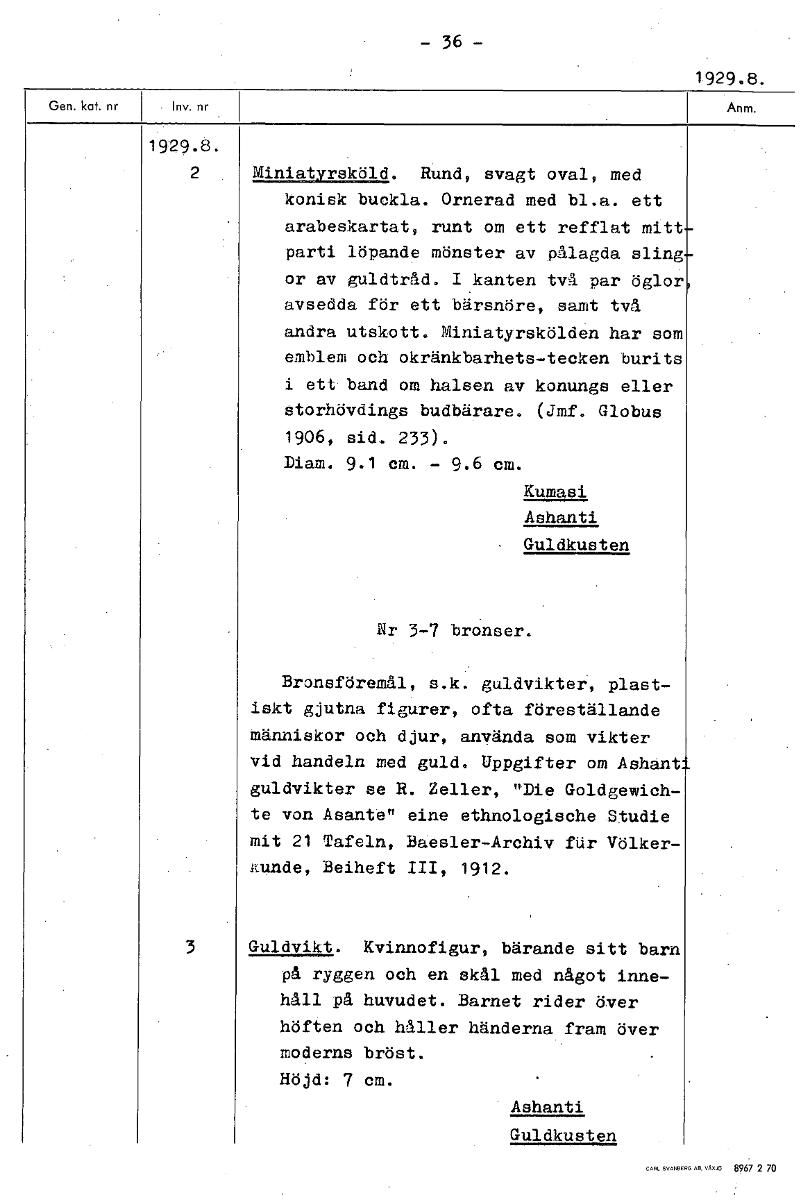 - 36 - 1929.8. 1929.8. 2 Miniatyrsköld. Rund, svagt oval, med konisk buckla. Ornerad med bl.a. ett arabeskartat, runt om ett refflat mitt parti löpande mönster av pålagda sling or av guldtråd. I kanten två par öglor avsedda för ett bärsnöre, samt två andra utskott. Miniatyrskölden har som emblem och okränkbarhets-tecken burits i ett band om halsen av konungs eller storhövdings budbärare. (Jmf. Globus 1906, sid. 233). Diam. 9.1 cm. - 9.6 cm. Kumasi Ashanti • Guldkusten Nr 37 bronser. Bronsföremål, s.k. guldvikter, plast- iskt gjutna figurer, ofta föreställande människor och djur, använda som vikter vid handeln med guld. Uppgifter om Ashant guldvikter se R. Zeller, "Die Goldgewich- te von Asante" eine ethnologische Studie mit 21 Tafeln, Baesler-Archiv fur Völker- unde, Beiheft III, 1912. 3 Guldvikt. Kvinnofigur, bärande sitt barn på ryggen och en skål med något inne- håll på huvudet. Barnet rider över höften och håller händerna fram över moderns bröst. Höjd: 7 cm. Ashanti Guldkusten [ocr]