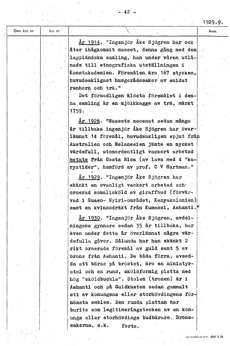 -42 1929.9. År 1914. "Ingenjör Åke Sjögren har ock åter ihågkommit museet, denna gång med den lappländska samling, han under våren utlå- nade till etnografiska utställningen i Konstakademien. Föremål ...