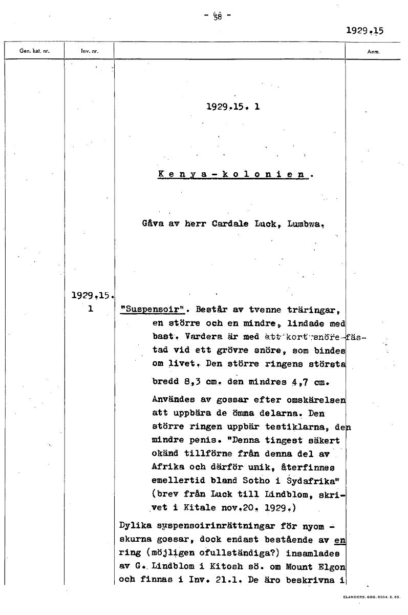 • 1929e5 1929.15. 1 Kenya-kolonien. Gåva av herr Cardale Luck,. Lumbwa. 1929.15. 1 "Suspensoir". Består av tvenne träringar, en större och en mindre,, lindade med bast-. Vardera är med ättlkartTsndi4e- ... Visa hela