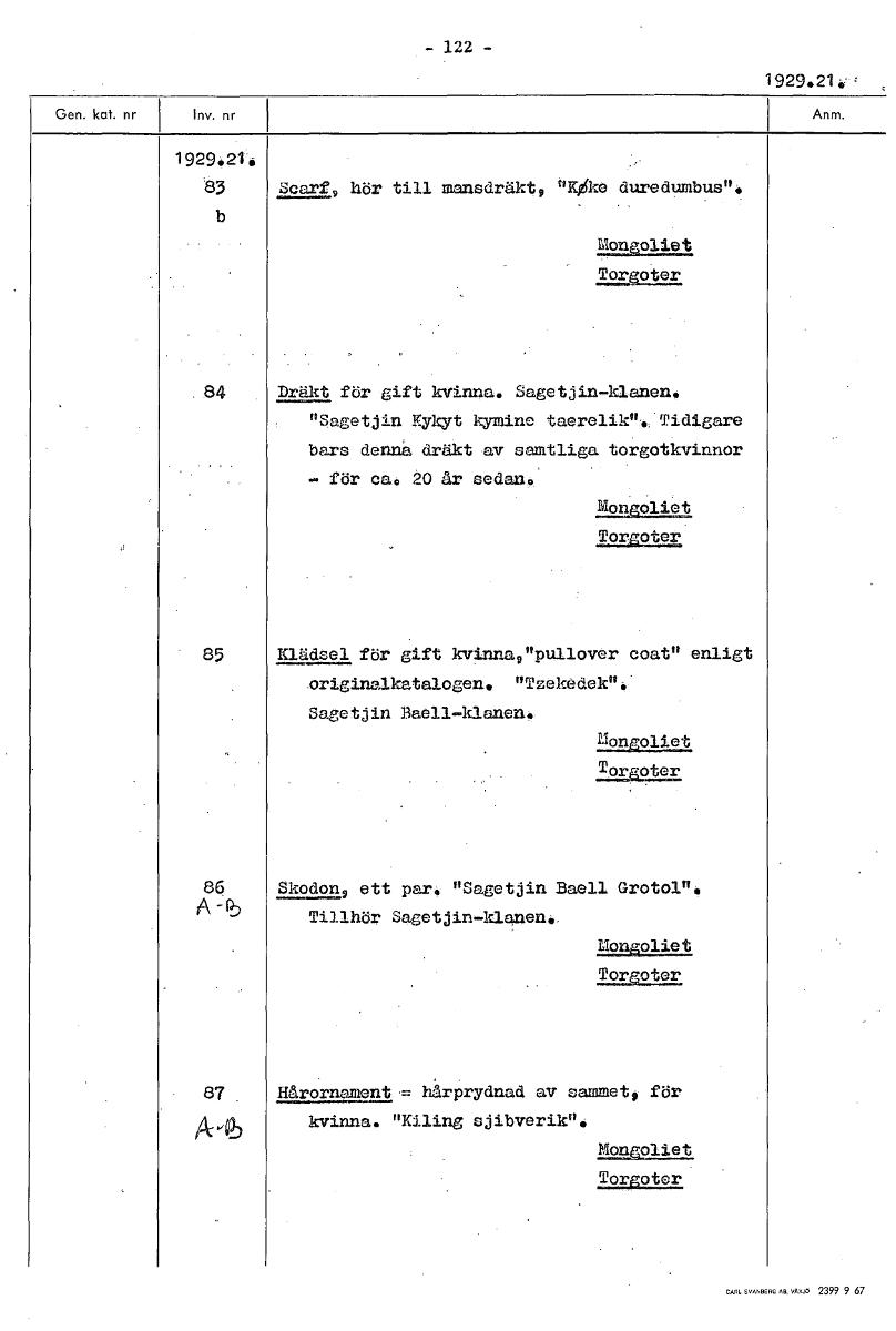 - 122 - 1929.21-2 1929.24 83 Scarf, hör till mansdräkt, "KOke duredumbus". b Ekuoliet Tor otIr 84 Dräkt för gift kvinna. Sagetjin-klanen. "Sagetjin Kykyt kymine taerelik". Tidigare bars denna dräkt av samtliga torgotkvinnor - för ca. 20 år sedan. MongOliet 292u9.19I 85 Klädsel för gift kvinna,"pullover coat" enligt originalkatalogen. "Tzekedck". Sagetjin Baell-klanen. Mongoliet 12.3a91.151 86 Skodon, ett par. "Sagetjin Baell Grotel". A -b Tillhör Sagetjin-klanen., Mongoliet Zorgotcr. 87 Hårornament = hårprydnad av sammet 9 för A-6 kvinna. "Kiling sjibverik". M9911911At. Torgoter [ocr]Stäng