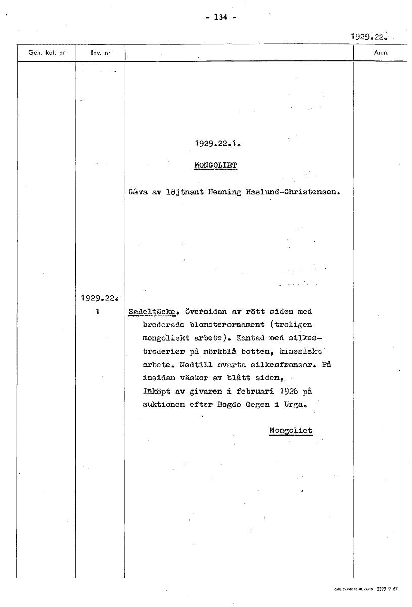 • - 134 - 1929,22' 1929.22.1, MONGOLIET Gåva av löjtnant Henning Hasiund-Christensen. 1929.22. 1 Sadeltäcke översidan av rött siden med broderade blomsterornament (troligen mongoliskt arbete). Kantad me... Visa hela