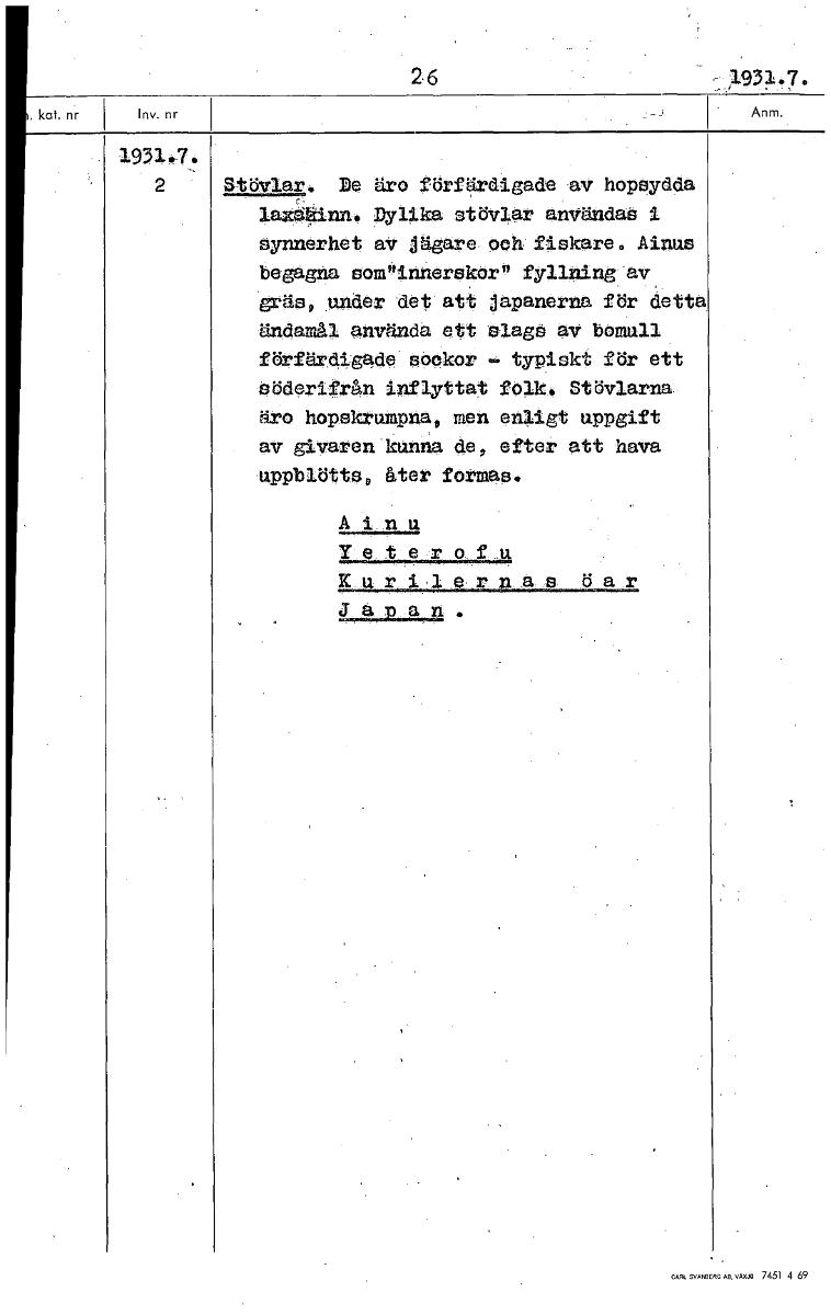 • 26 - , 1931 . 7 • 1931.7. 2 Stövlar. De äro förfärdigade av hopsydda lazginn. Dylika stövlar användas 1 synnerhet av jägare och fiskare. Alnus begagna somninnerekern fYilning av gräs under det att jap... Visa hela