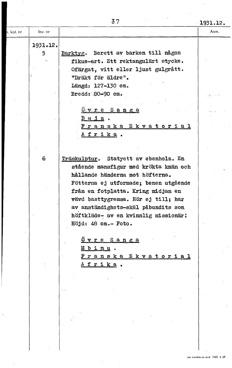 3 7 1931.12. 1951 12. 5 Barktyg. Berett av barken till någon fikus-art. Ett rektangulärt stycke. Ofärgat9 vitt eller ljust gulgrått. "Dräkt för äldre". Längd: 127-130 cm. Bredd: 60-90 em. ilvre Sagga B a a . Franska Ekvatorial Afrika. 6 Träskulptur. Statyett av ebenholz. En stående mansfigur med krökta knän och hållande händerna mot höfterna. Fötterna ej utformade; benen utgående från en fotplatta. Kring midjan en vävd basttygremsa. Hör ej till; har av anständighets-skäl påbundits som htftkläde7 av en kvinnlig missionär! Höjd: 48 cm.- Foto. övre Sanga Franska Ekvatorial Afrika. [ocr]Stäng