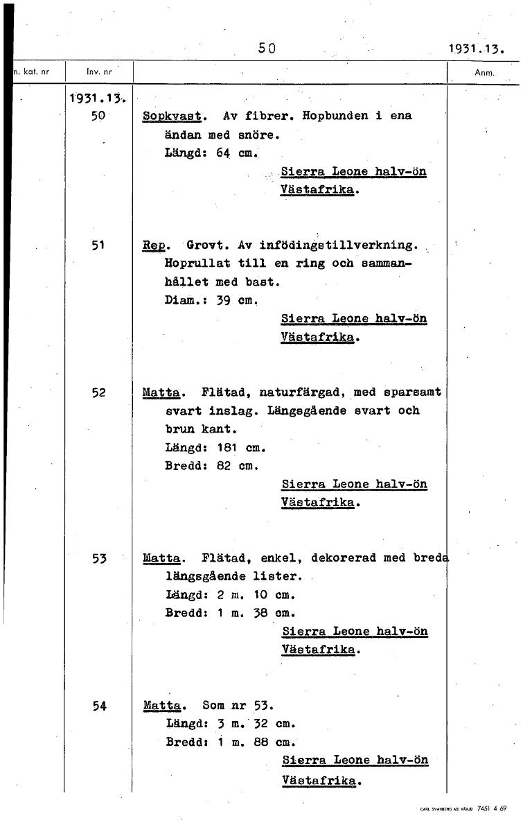 i 5 0 1931,13. t931.13,. 50' Sopkvast,. Av fibrer. Hopbunden i ena ändan med snöre. Längd: 64 cm: .Sierra Leone halv-ön Västafrika. 51 11S2. Grovt. Av infödingstillverkning. Hoprullat till en ring och samman- hållet med bast. Diam.: 39 cm. Sierra Leone halv-ön Västafrika. 52 Matta. Flätad, naturfärgad, med sparsamt svart inslag. Längsgående svart och brun kant. Längd: 181 cm. Bredd: 82 cm. Sierra Leone halv-ön Västafrika. 53 Matta. Flätad, enkel, dekorerad med bred längsgående lister. Längd: 2 m. 10 cm. Bredd: 1 m. 38 cm. Sierra Leone halv-ön Västafrika. 54 Matta. Som nr 53. Längd: 3 m. 32 cm. Bredd: 1 m. 88 cm. Sierra Leone halv-ön Västafrika. [ocr]