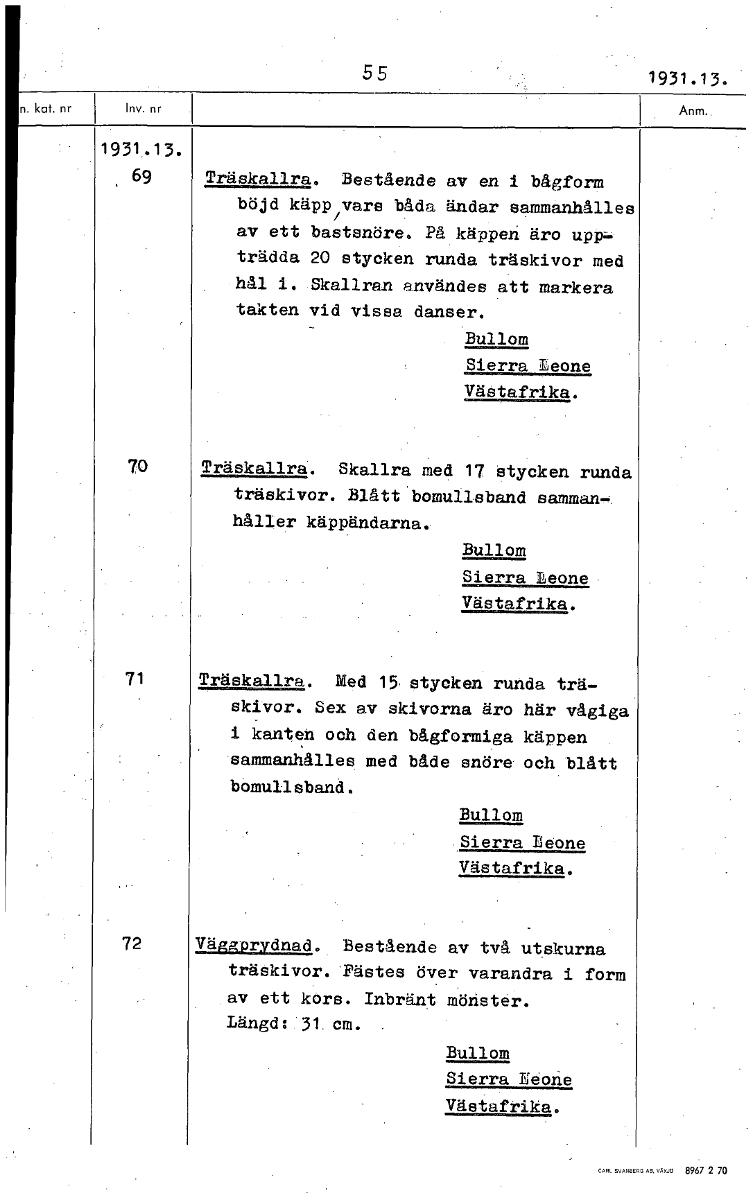 55 1931.13. 1931,13. 69 Träskallra. Bestående av en i bågform böjd käpp/vars båda ändar sammanhålles av ett bastsnöre. På käppen äro upp- trädda 20 stycken runda träskivor med hål i. Skallran användes att markera takten vid vissa danser. Bullom Sierra Leone Västafrika. 70 Träskallra. Skallra med 17 stycken runda träskivor. Blått bomullsband samman- håller käppändarna. Bullom Sierra Leone Västafrika. 71 Träskallra. Med 15 stycken runda trä- skivor. Sex av skivorna äro här vågiga i kanten och den bågformiga käppen sammanhålles med både snöre och blått bomullsband. Bullom Sierra Leone Västafrika. 72 Väggprydnad. Bestående av två utskurna träskivor. Fästes över varandra i form av ett kors. Inbränt mönster. Längd: 31 cm. Bullom Sierra Neone Västafrika. [ocr]Stäng