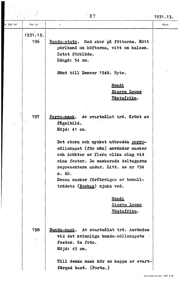 8 7 1931.13. 1931.13. 196 Bundu-staty. Med skor på fötterna. Rött pärlband om höfterna, vitt om halsen. Intet förkläde. Längd: 54 em. Sänt till Denver 1948. Byte. Mendi Sierra Leone Västafrika. 197 Porro-mask. Av svartmålat trä. Krönt av fågelbild. Höjd: 41 cm. Det stora och mycket utbredda porro- sällskapet (för män) använder masker och dräkter av flera olika slag vid sina fester. De maskerade deltagarna representera andar. Litt. se nr 194 s. 60. Dessa masker förfärdigas av bomull- trädets (Bombax) mjuka ved. Mendi Sierra Leone Västafrika. 198 Bundu-mask. AV svartmålat trä. Användes vid det kvinnliga bundu-sällskapets fester. Se foto. Höjd: 45 cm. Till denna mask hör en kappa av svart- färgad bast. (Forts.) [ocr]Stäng
