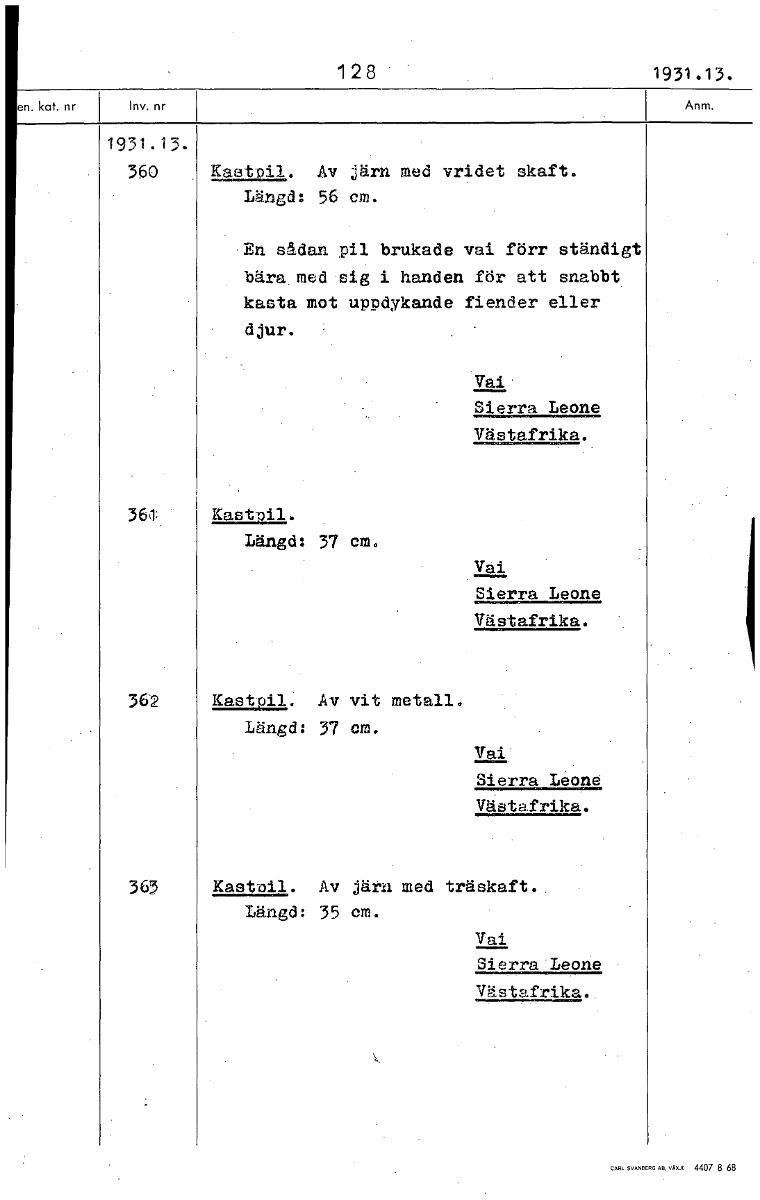 • 1 28 1931 .13. 1931.13. 360 Kastoil. Av järn med vridet skaft. Längd: 56 cm. En, sådan pil brukade vai förr ständigt bära med sig i handen för att snabbt kasta mot uppdykande fiender eller djur. Val S... Visa hela
