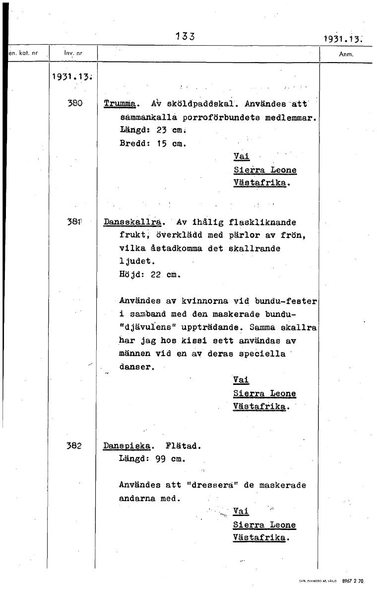 i 133 1931.13. 1931.13: 380 Trumma. A.Iv sköldpaddskal. Användes att eåmmankalla porroförbundets medlemmar. Längd: 23 cm; Bredd: 15 cm. Val Sierra Leone Västafrika. 3&r Dansekallra. Av ihålig flaskliknande frukt, överklädd med pärlor av frön, vilka åstadkomma det skallrande ljudet. Höjd: 22 cm. Användes av kvinnorna vid bundu-fester i samband med den maskerade bundu- "djävulens" uppträdande. Samma skallra har jag hos kisel sett användas av männen vid en av deras speciella danser. Vai Sierra Leone Västafrika. 382 Danspiska. Flätad. Längd: 99 cm. Användes att "dressera" de maskerade andarna med. Vai Sierra Leone Västafrika. [ocr]Stäng