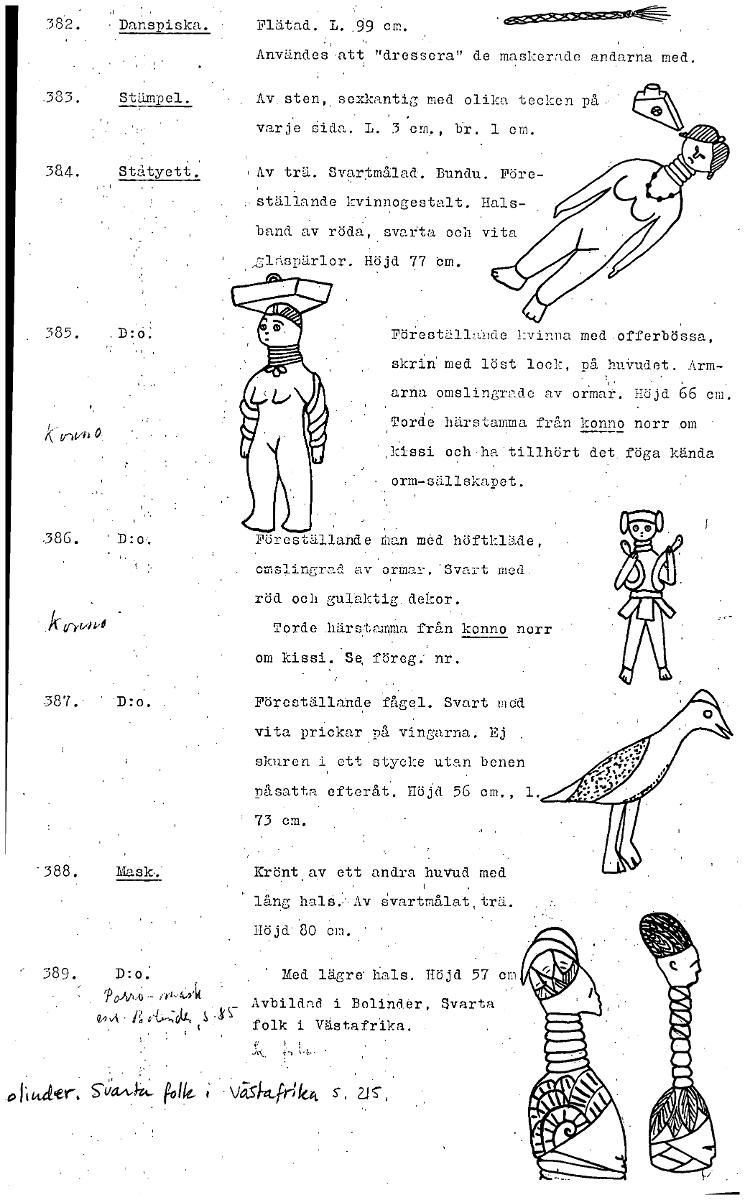 • 382. • Danspiska. Flätad. L. .99 cm. Användes att "dreäsera" de maskerade andarna med, 583. Stämpel. Av sten, sexkantig med olika tecken på varje Sida. L. 3 cm., br. 1 cm. Statyett: liv trä. Svartmåla... Visa hela
