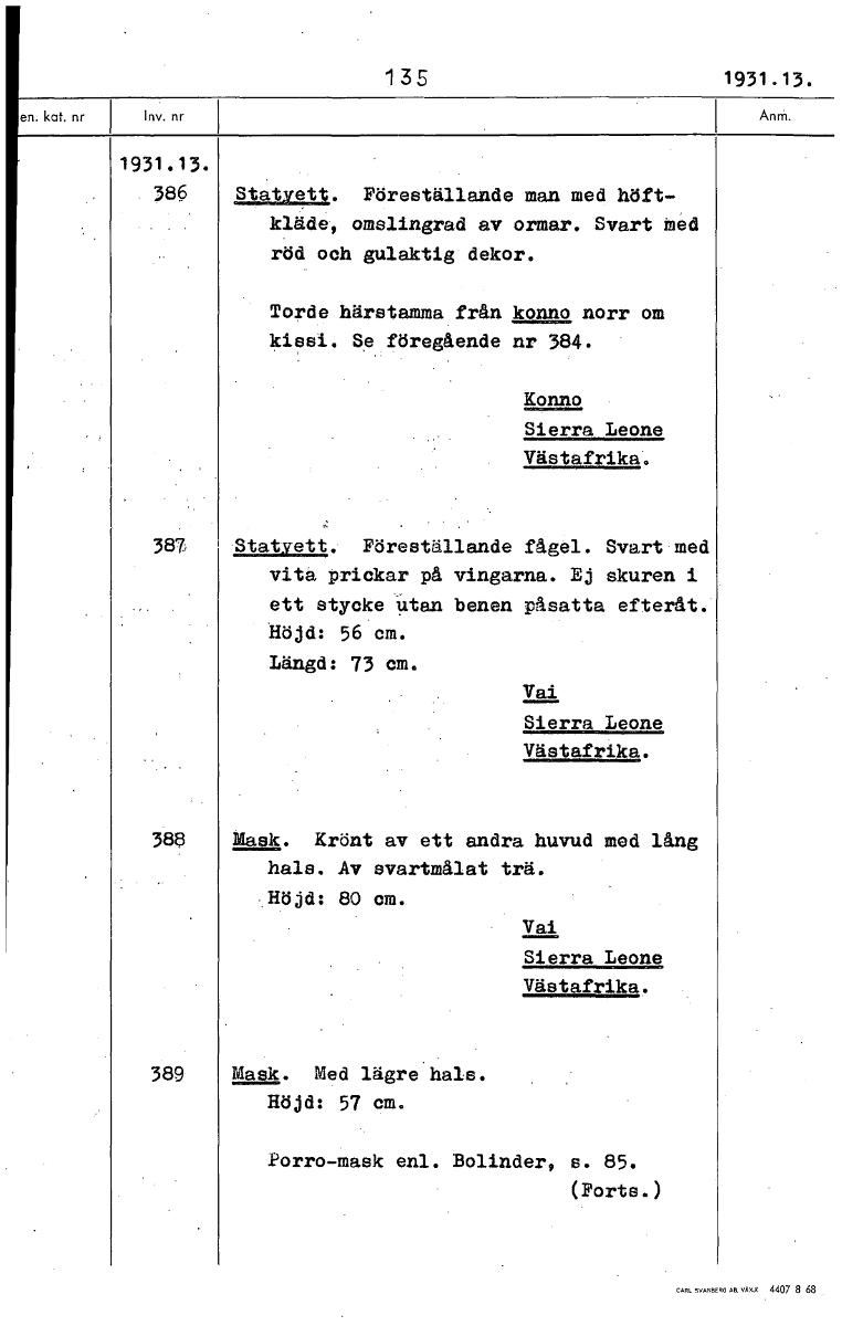 1 3 5 1931.13. 1931.13. 386 Statyett. Föreställande man med höft- kläde, omslingrad av ormar. Svart ined röd och gulaktig dekor. Torde härstamma från konno norr om kisel. Se föregående nr 384. Konno Sierra Leone Västafrika 387 Statyett. Föreställande fågel. Svart med vita prickar på vingarna. Ej skuren i ett stycke utan benen påsatta efteråt. Höjd: 56 cm. Längd: 73 cm. Vai Sierra Leone Västafrika. 388 Mask. Krönt av ett andra huvud med lång hals. Av svartmålat trä. Höjd: 80 cm. Vai Sierra Leone Västafrika. 389 Mask. Med lägre hals. Höjd: 57 cm. Porro-mask enl. Bolinder, s. 85. (Forts.) [ocr]Stäng