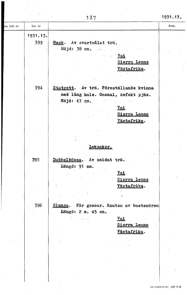 • l 137 1931,13. 1931.13. 393 Mask. Av svartmålat trä. Höjd: 38 cm. Vai Sierra Leone Västafrika. 394 Statyett. Av trä. Föreställande kvinna med lång hals. Gammal, defekt pjäs. Höjdt.43 cm. Val Sierra Le... Visa hela