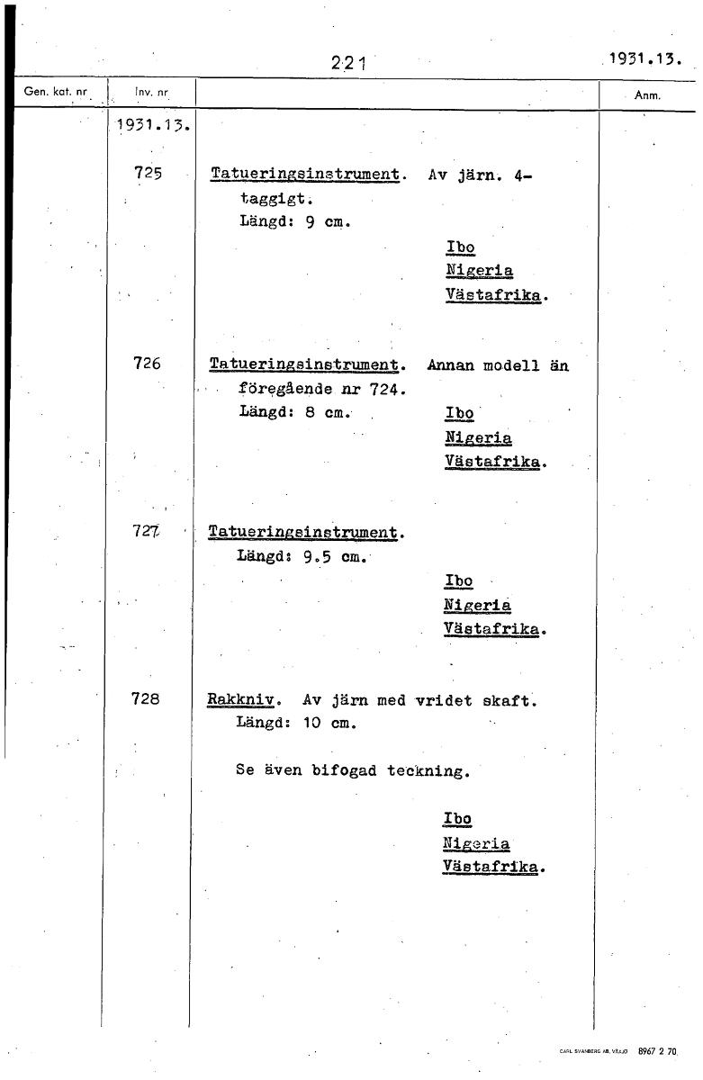 • 221 1931.13. 1 931 . 1 3 . 725 Tatueringsinstrument. Av järn. 4- taggigt. Längd: 9 cm. Ibo Västafrika. 726 Tatueringsinstrument. Annan modell än föregående nr 724. Längd: 8 cm. , Ibo Nigeria Västafrik... Visa hela