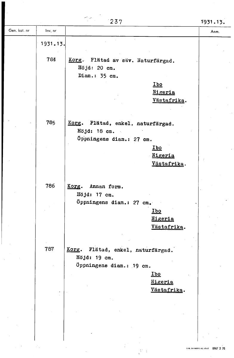 • 2 3 7 1931.13. 1 931 . 1 3 . 784 Korg. Flätad av säv. Naturfärgad. Höjd: 20 cm. Diam.: 35 cm. Ibo Nigeria Västafrika. 785 Kora. Flätad, enkel, naturfärgad. Höjd: 18 cm. öppningens diam.: 27 cm. Ibo Ni... Visa hela
