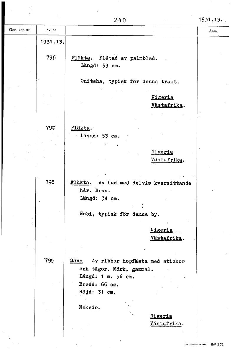 • 240 1,931,13.. 1931.13. 796 Fläkta. Flätad av palmblad. Längd: 59 cm. Onitsha, typisk för denna trakt. Nigeria Västafrika. 797 Fläkta. Längd: 53 cm. Nigeria Västafrika. 798 Fläkta. Av hud med delvis k... Visa hela