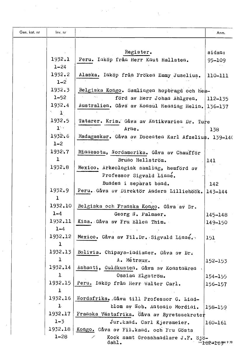 Register. sidan: 1932.1 Peru. Inköp från Herr Knut Hallsten. 95-109 1-24 1932.2 Alaska. Inköp från Fröken Emmy Juselius. 110-111 1932.3 Belgiska Kongo. Samlingen hopbragd och }e 1-52 förd av herr Joha...