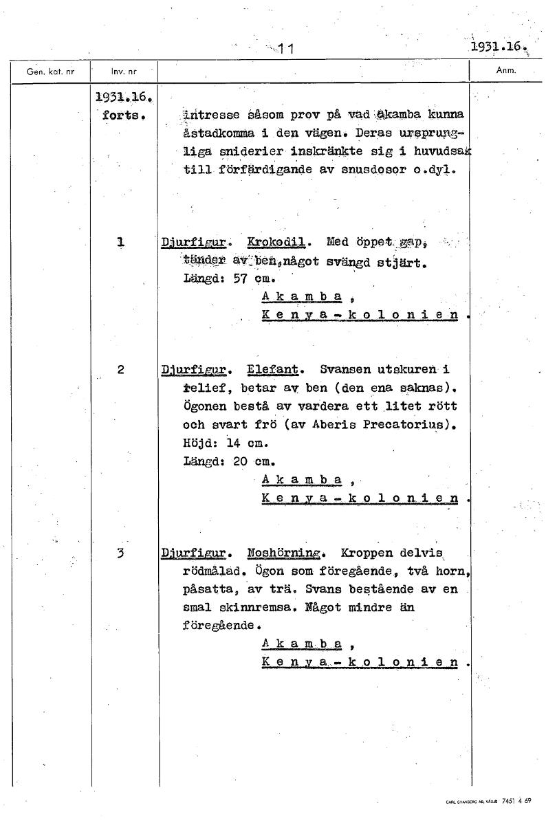 11 1931.1 19n464, 'fötts. låtresse såsom prov på vadAkamba kunna åstadkomma i den vägen. Deras ursprung- liga sniderier inskränkte sig i huvudsa till förfärdigande av snusdosor o.dyl. LILlr_figur. Krokodil. Med öppet ...glin tägder avJjenonågot svangd stjärt. Längd: 57 om. Akamba, 2 Djurfigur. Elefant. Svansen utskuren i telief, betar av ben (den ena saknas). Ögonen bestå av vardera ett litet rött och svart frö (av Aberis Precatorius). Höjd: 14 cm. Längd: 20 cm. Akamba Kenya- olonien. Djurfigur. Noshörning. Kroppen delvis, rödmålad. Ögon som föregående, två horn, påsatta, av trä. Svans bestående av en smal skinnremsa. Något mindre än föregående. Akamba, Ken22, ko l on en. [ocr]