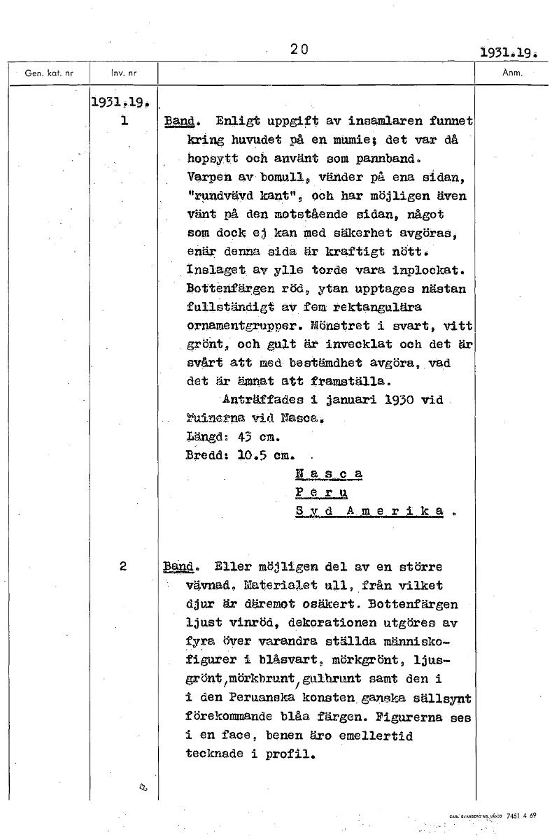 20 1931i19ib 1931,19. Band. Enligt uppgift av insamlaren funnet kring huvudet på en mumie; det var då hopsytt och använt som pannband. Varpen av bomull, vänder på ena sidan, "rUndväVd kant", och bar möjligen även vänt på den motstående sidan, något som dock ej kan med säkerhet avgöras, enär denna sida är kraftigt nött. Inslaget, av ylle torde vara inplockat. Bottenfärgen röd, ytan upptages nästan fullständigt av fem rektangulära ornamentgrupper. Mönstret i svart, vitt grönt, och gult är invecklat och det är svårt att med bestämdhet avgöra, vad det är ämnat att framställa. Anträffades i januari 1930 vid tuinerna vid Nasea. Längd: 43 cm. Bredd: 10.5 cm. . N asca P eru. S vd Amerika. 2 Band. Eller möjligen del av en större vävnad. Materialet ull, från vilket djur är däremot osäkert. Bottenfärgen ljust vinröd,, dekorationen utgöres av fyra över varandra ställda människo- figurer i blåsvart, mörkgrönt, ljusgrönt/mörkbruntlgulbrunt samt den i i den Peruanska konsten ganska sällsynt förekommande blåa färgen. Figurerna ses i en face, benen äro emellertid tecknade i profil. et, [ocr]