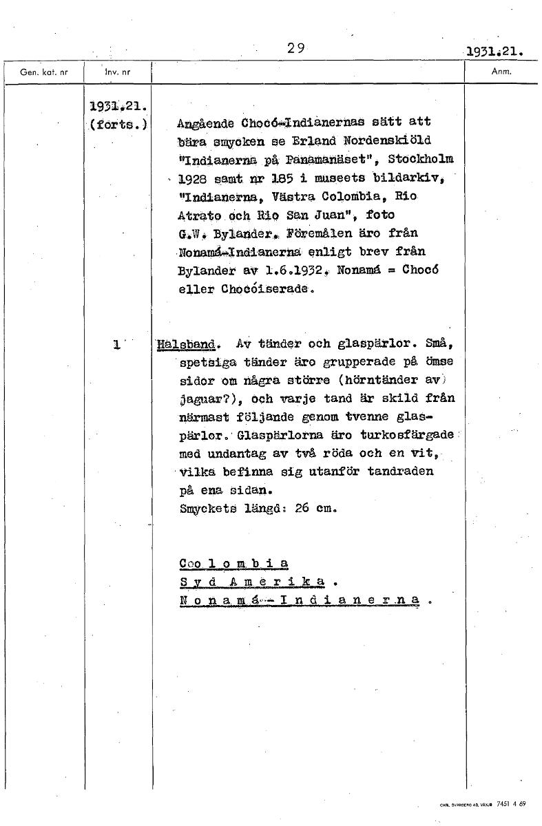 29 1931.21. 1931.21. (forts.) Angående Choc6.Indiänernas sätt att bära smycken se Erland Nordenskiöld "Indianerna På Fanamanäset"„ Stockholm 1928 samt nr 185 i museets bildarkiv, "Indianerna, Västra C...