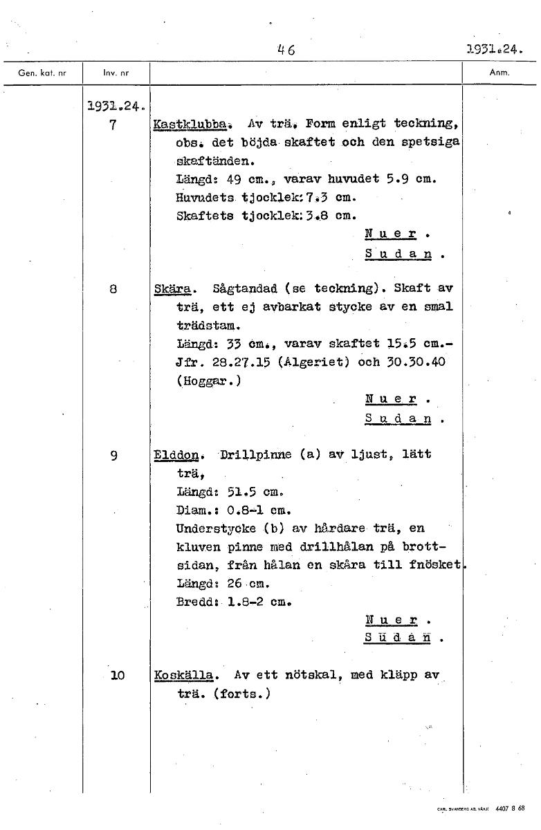 4 6 1931.24 1931.24. 7 K_astklubbal Av trä. Form enligt teckning, obs. det böjda-skaftet och den spetsiga skaftänden. Längd: 49 cm., varav huvudet 5.9 cm. Huvudets tjocklek:7.3 cm. Skaftets tjocklek:3.8 cm. N u e r . Sudan 8 Skära. Sågtandad (se teckning). Skaft av trä, ett ej avbarkat stycke av en smal trädstam. Längd: 33 cm,, varav skaftet 15.5 cm.- Jfr. 28.27.15 (Algeriet) och 30.30.40 (Hoggår.) N u e r . S udan. 9 Elddon. Drillpinne (a) av ljust, lätt trä, Längd: 51.5 cm. Diam.: 0.8-1 cm. Understycke (b) av hårdare trä, en kluven pinne med drillhålan på brott- sidan, från hålan en skåra till fnösket Längd: 26 cm. Bredde 1.8-2 cm. N u e t . S u d å n 10 Koskälla. Av ett nötskal, med kläpp av trä. (forts.) [ocr]