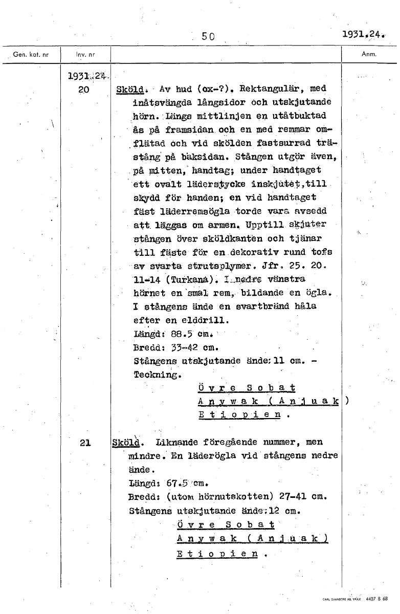 50 1931.24. 1931...24. 20 Sköld: Av hud (ox-?). Rektangulär, med inåtsvängda långsidor öch utskjutande hörn. Längs mittlinjen en utåtbuktad ås på framsidan och en med remmar om- flätad öch vid skölden fastsurrad trä- stång' på båksidan. Stången utgör även,. på mitten,' handtag; under handtaget ett ovalt läderstycke inskjåte,till skydd för handen; en vid handtaget fäst läderremsögla torde vara avsedd att läggas om armen. Upptill slOuter stången över sköldkanten och tjänar till fäste för en dekorativ rund tofs .av svarta strutsplymer. Jfr. 25. 20. 11-14 (Turkana). -.L.n0-cire vänstra hörnet en 'smal rom,. bildande en ögla. I stångens ände en svartbränd håla efter en elddrill. Längd: 88.5 cm. Bredd: 33-42 cm. Stångens utskjutande ände:11 cm. Teckning. Övre Sobat Etiopien. 21 Sköld. Liknande föregående nummer, men mindre. En läderögla vid stångens nedre ände. Längd: 67.5 om. Bredd: (utom hörnutskotten) 27-41 cm. Stångens utskjutande ände; 12 cm. Övre Sobat Etiopien. [ocr]Stäng