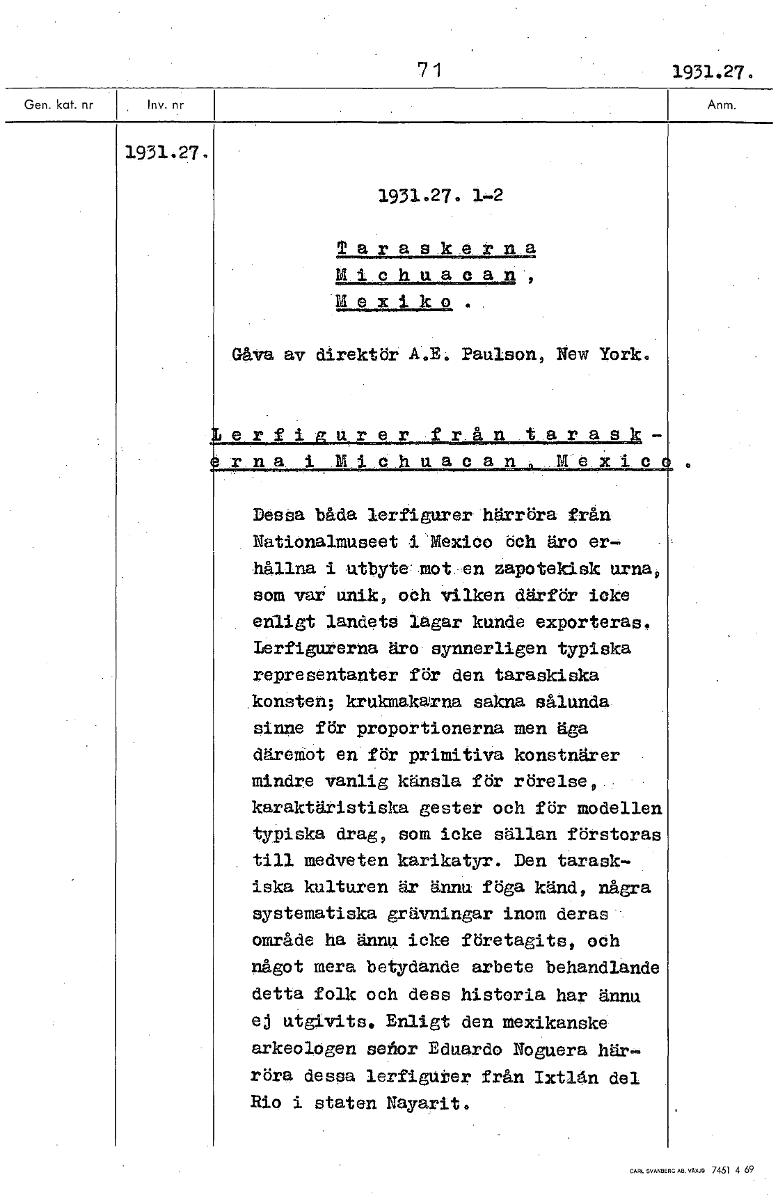 • 71 1931.27. 1931.27. 1931.27. 1-2 Taraskerna Michuacan, Mexiko. Gåva av direktör A.E. Paulson, New York. erfi uren från tarask- rna i X47ichu.acan Mexic Dessa båda lerfigurer härröra från Nationalmuse... Visa hela