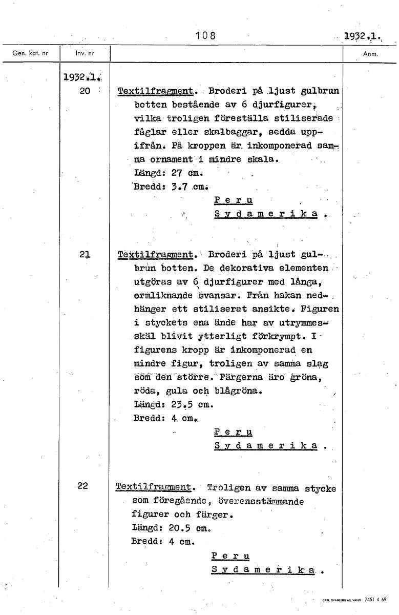 108 24.9324:4 20 Textilfragment. Broderi på ,ljust gulbrun botten bestående av 6 djurfigurer, vilka troligen föreställa stiliserade fåglar eller skalbaggar, sedda upp- ifrån. På kroppen än inkomponerad sambT. ma ornament .1 mindre skala. Längd: 27 cm. Bredd: 37 cm. Peru x_gamerika 21 Teglållogglänt. Broderi på ljust gul-- brån botten. De dekorativa elementen utgöras av 6 djurfigurer med långa, ordliknande Svansar; Prån hakan ned-, hänger ett stiliserat ansikte. Figuren i styckets ena ände har av utrymmes- skäl blivit ytterligt förkrympt. 1 figurens kropp är inkomponerad en mindre figur, troligen av samma slag Säd-den 'större. Pärgerna äro gröna, röda, gula och blågröna. Längd: 23.5 cm. Bredd: 4. cm. Peru Sydamerika. 22 Textilfragment. Troligen av samma stycke som föregående, överensstämmande figurer och färger. Längd: 20.5 em. Bredd: 4 cm. Peru §zjamerika. [ocr]