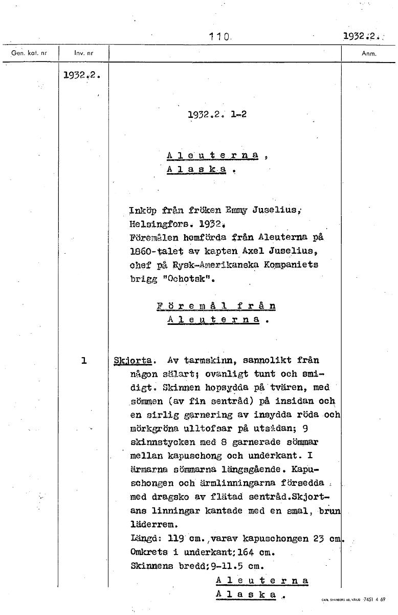 1 1 0. 1932 . G 1932.2. 1932.2. 1-2 Aleuterna, Alaska. Inköp från fröken Emmy Juseliusi Helsingfors. 1932, Föremålen hemförda från Aleuterna på 1660-talet av kapten Axel Juselius, chef på Rysk-Amerika...