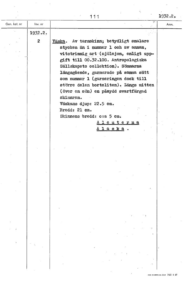 1 1 1 1932.2. 193.2.2. 2 Väska. Av tarmskinn; betydligt smalare stycken än i nummer 1 och av annan, vitstrimmig artAsjölejon, enligt upp- gift till 00.32.106. Antropologiska Sällskapets collektion). Sömmarna längsgående, garnerade på samma sätt som nummer 1 (garneringen dock till större delen bortsliten). Längs mitten (över en söm) en påsydd svartfärgad skinnrem. Väskans djup: 22.5 cm. Bredd: 21 cm. Skinnens bredd: c:a 5 cm. A leuterna Alaska. [ocr]Stäng