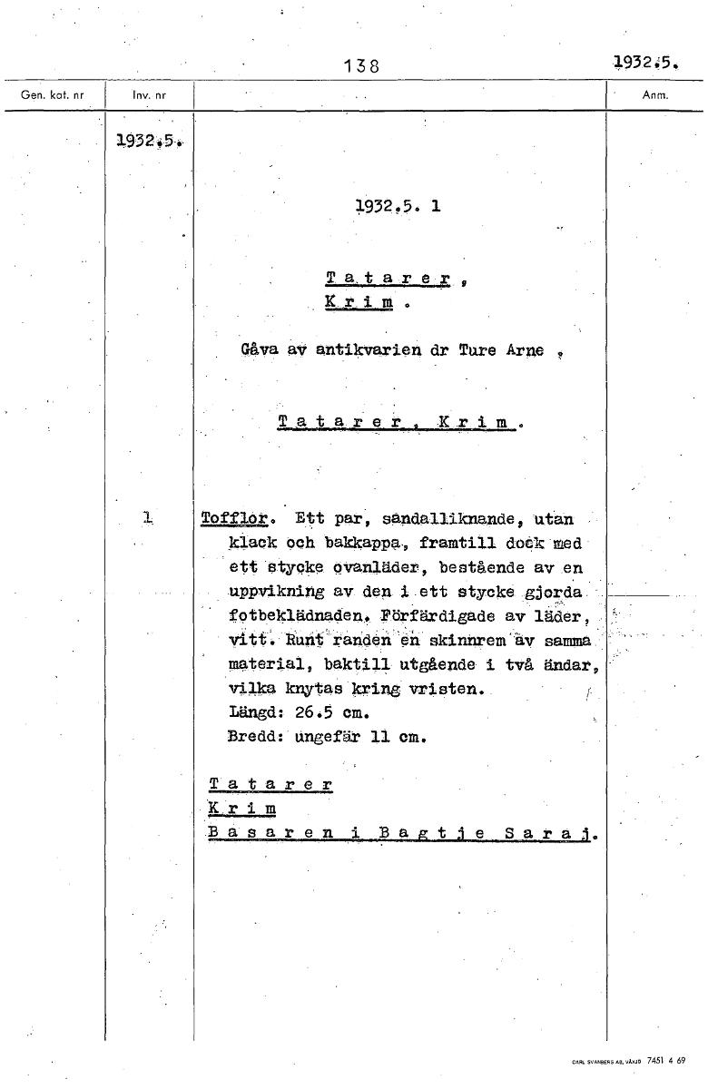 138 1932.5. 1932.5. 1 Tatarer, Kr im. Gåva av antikvarien dr Ture Arne Tatarer, Krim Tofflor. Ett par, sandalliknande, utan klack och bakkappa, framtill dock med ett stycke ovanläder, bestående av en ...