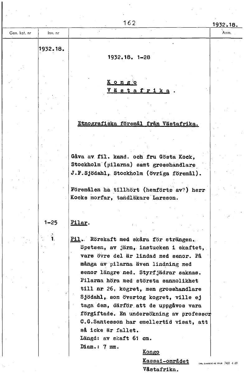 162 1932.18. 1932.18. 1932.18. 1 28 Kong 'o Västar r ika. Etnografiska föremål från Vättafrika. Gåva av fil. kand. och fru Gösta.Kock, Stockholm'(pilarna) samt grosshandlare J.P.Sjödahl,, Stockholm (ö...