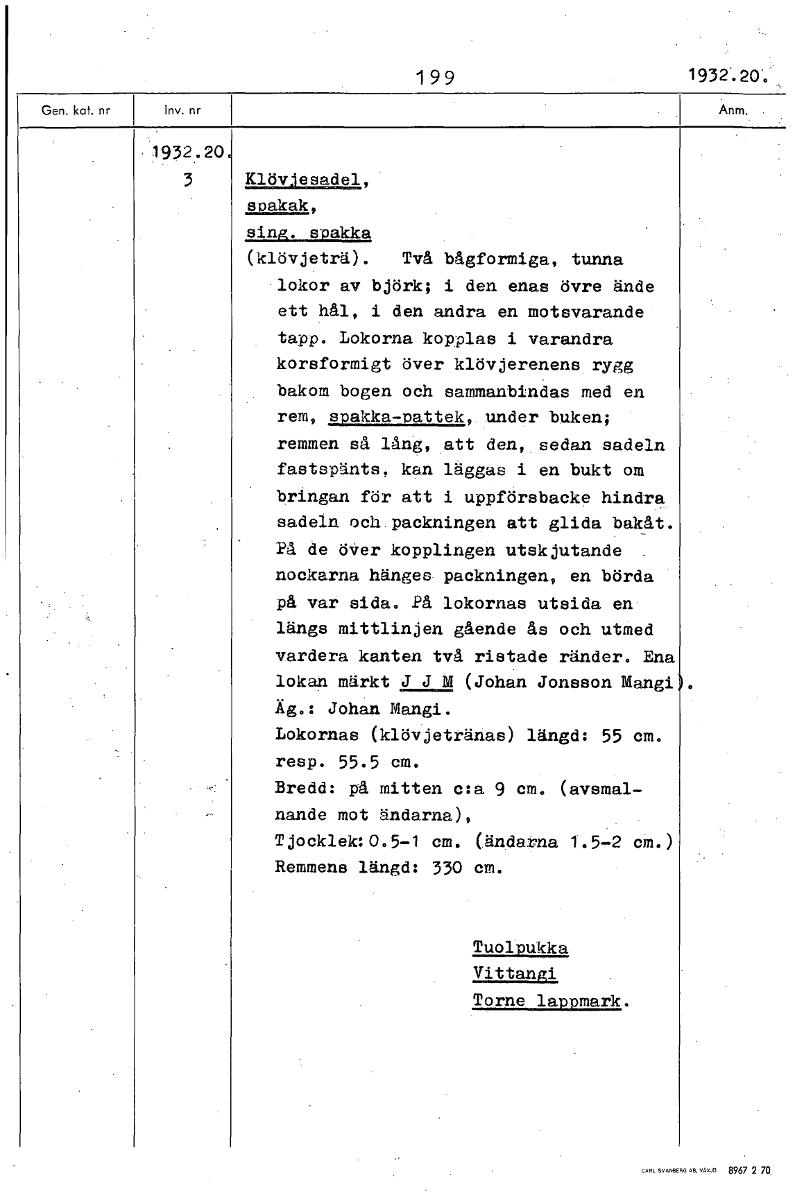 199 1932.20'. 1932.20 3 Klövjesadel, spakak, sing. spakka (klövjeträ). Två bågformiga, tunna lokor av björk; i den enas övre ände ett hål, i den andra en motsvarande tapp. Lokorna kopplas i varandra korsformigt över klövjerenens rygg bakom bogen och sammanbindas med en rem, spakka-pattek, under buken; remmen så lång, att den, sedan sadeln fastspänts, kan läggas i en bukt om bringan för att i uppförsbacke hindra sadeln och packningen att glida bakåt. På de över kopplingen utskjutande nockarna hänges packningen, en börda på var sida. På lokornas utsida en längs mittlinjen gående ås och utmed vardera kanten två ristade ränder. Ena lokan märkt J J M (Johan Jonsson Mangi Äg.: Johan Mangi. Lokornas (klövjetränas) längd: 55 cm. resp. 55.5 cm. Bredd: på mitten c:a 9 cm. (avsmal- nande mot ändarna), Tjocklek:0.5-1 cm. (ändarna 1.5-2 cm. Remmens längd: 330 cm. Tuolpukka Vittangi Torne lappmark. [ocr]