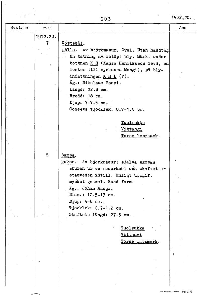 203 1932.20.. 1932.20. 7 Köttskål, .ållo. Av björkmaeur. Oval. Utan handtag En tätning av istöpt, bly. Märkt under bottnen K H (Kajsa Henriksson Sevä, en Moster till syskonen Mangi), på bly- infattningen K H L (7). Äg.: Nikolaus Mangi. Längd: 22.8 em. Bredd: 18 cm. Djup: 7-7.5 cm. Godsets tjocklek: 0.7-1.5 cm, Tuolpukka Vittangi Torne lapomark. 8 Skopa, kukse. Av björkmasur; själva skopan skuren ur en masurknöl och skaftet ur stamveden intill. Enligt uppgift mycket gammal. Rund form. Äg.: Johan Mangi. Diam.: 12.5-13 cm. Djup: 5-6 cm. Tjocklek: 0.7-1.2 cm. Skaftets längd: 27.5 cm. Tuolpukka Vittangi Torne lappmark. [ocr]