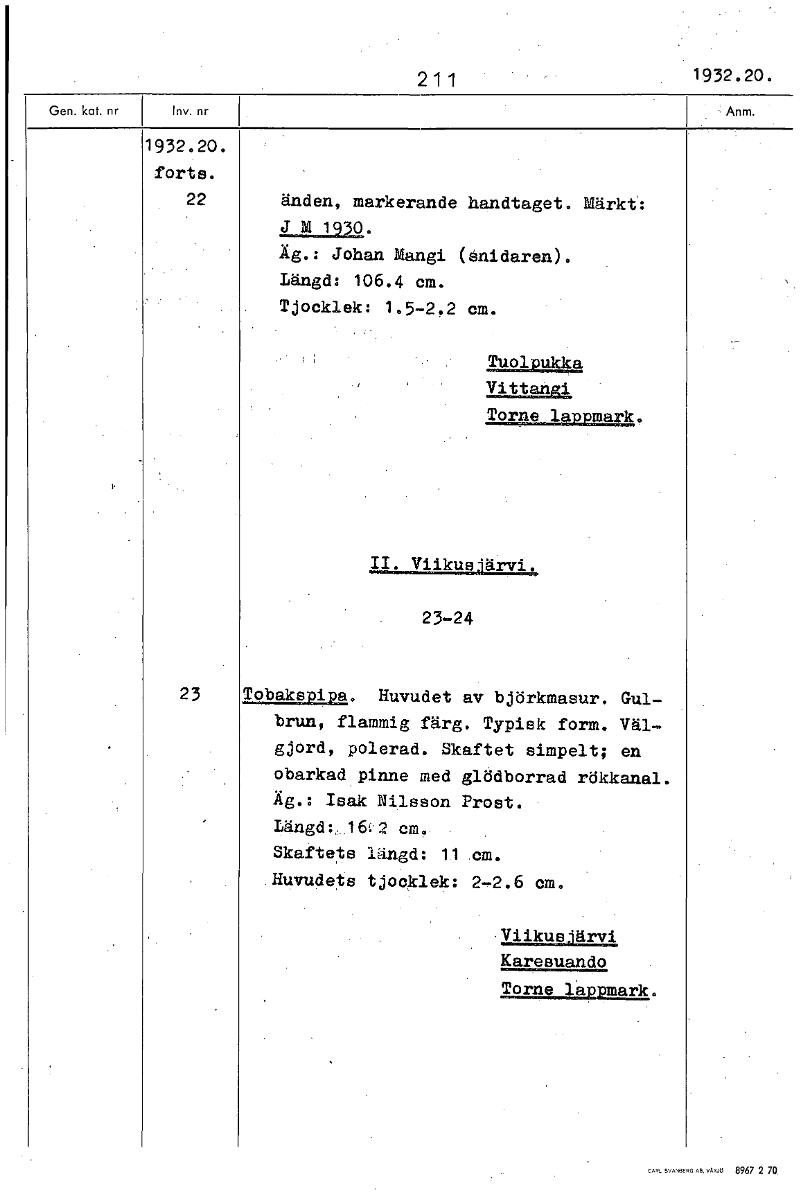 • 211 1932 . 20 . 1932.20. forts. 22 änden, markerande handtaget. Märkt: J M 1930. Äg.: Johan Mangi (snidaren). Längd: 106.4 cm. Tjocklek: 1.5-2.2 cm. Tuolpukka LIMarlak Torne lappmark. II. Viikusjärv .... Visa hela