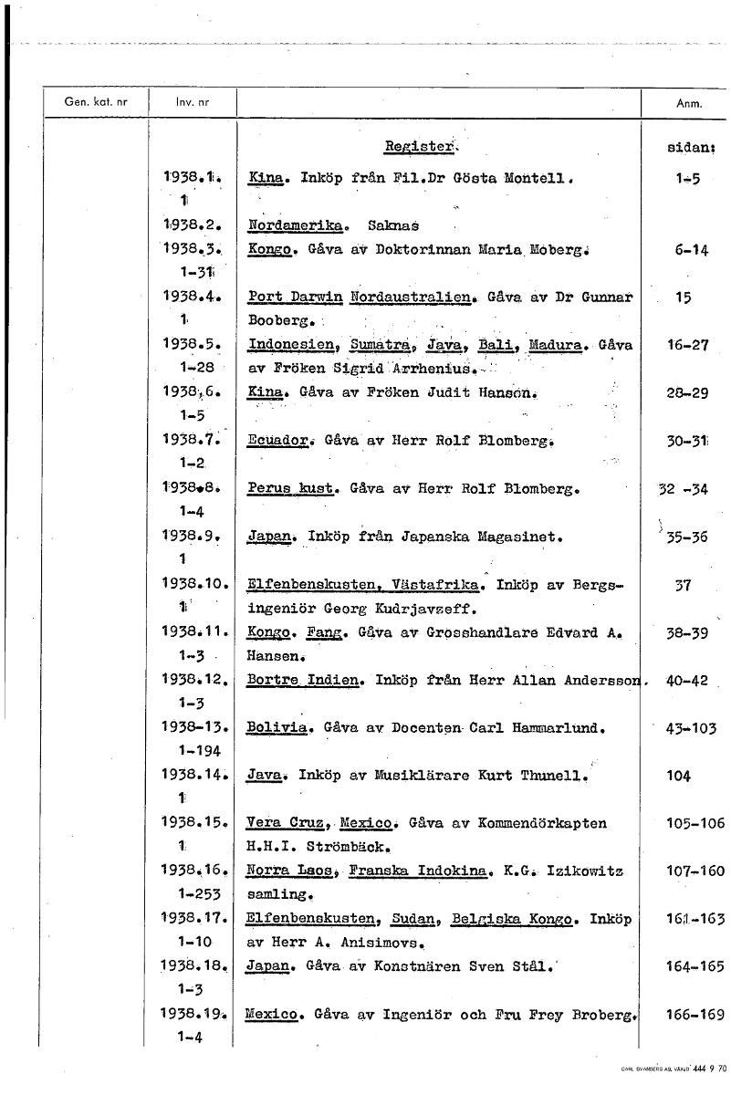 Register, sidans 1938.1. Kina. Inköp från Fil.Dr Gösta Montell. 1--5 1' 1't938.2. Nordamerika. Saknaå 1938.5.. Kongo. Gåva av Doktorinnan Maria Ebberg4 6-14 1-3t 1938.4. Port Darrvin Nordaustralien. Gåva av Dr Gunnar 15 1 BOoberg. 1938.5. Indonesien, Sumatra, Java, Bali Madura. Gåva 16-27 1-28 av Fröken Sigrid Arrhenius., 1938,.6. Kina. Gåva av Fröken Judit Hanson. 28-29 1-5 1938.7: Ecuador. Gåva av Herr Rolf Blomberg. 30-31 1-2 1938.8. Perus kust. Gåva av Herr Rolf Blomberg. 32 -34 1-4 1938.9. Japan. Inköp från Japanska Magasinet. 35-36 1 1938.10. Elfenbenskusten, VListafrika. Inköp av Bergs- 37 , ingenjör Georg Kudrjavzeff. 1938.11. Kongo. Pang. Gåva av Grosshandlare Edvard A. 38-39 1-3 Hansen. 1938.12, Bortre Indien. Inköp från Herr Allan Andersso . 40-42 . 1-3 1938-13. Bolivia. Gåva av Docenten Carl Hammarlund. . 43-103 1-194 1938.14. Java. Inköp av Musiklärare Kurt Thunell. 104 1 1938.15. Vera 0ruz4.Mexieo. Gåva av Kommendörkapten 105-106 H.H.I. Strömbäck. 1938.16. Norra Laos, Franska Indokina. K.Gå; Izikowitz 107-160 1-253 samlingt 1938.17. Elfenbenskusten, Sudan, Belgiska Kongo. Inköp 16;t163 1-10 av Herr A. Anisimovs. 1938.18. Japan. Gåva av Konstnären Sven Stål.' 164-165 13 1938.194. Mexico. Gåva av Ingenjör och Fru Frey Broberg. 166-169 1-4 [ocr]