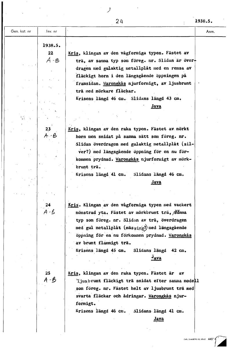 24 1938.5. 1938.5. 22 Kris, klingan av den vågformiga typen. Fästet av trä, av samma typ som föreg. nr. Slidan är över dragen med gulaktig metallplåt med en remsa av fläckigt horn i den längsgående öp...