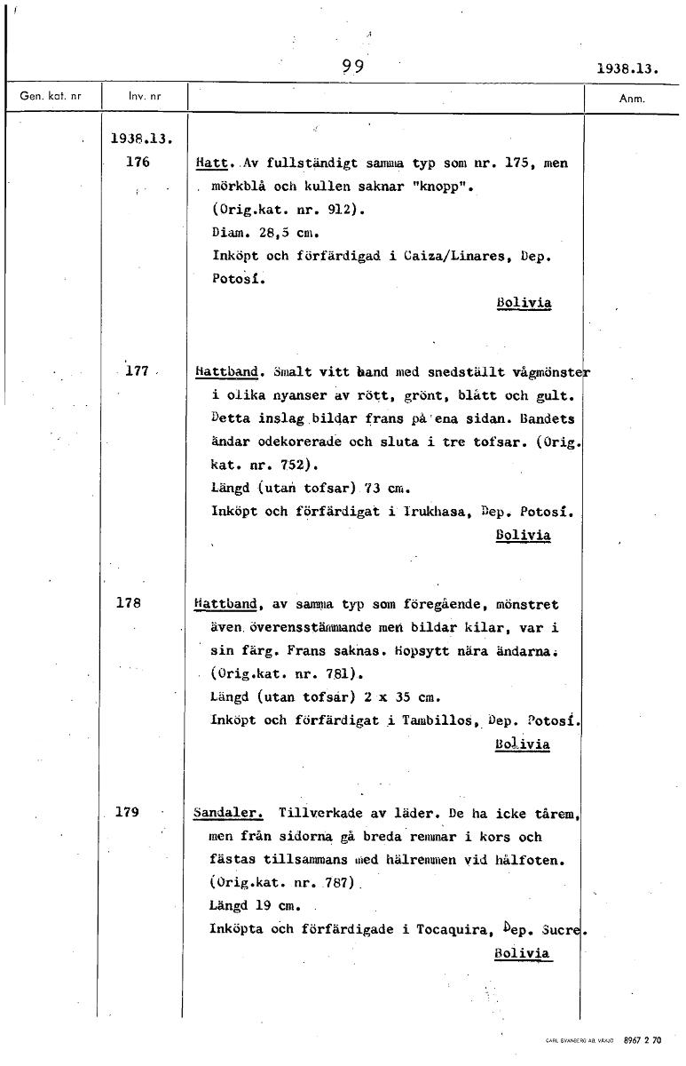 99 1938.13. 1938.13. 176 Hatt. Av fullständigt saaiuna typ som nr. 175, men . mörkblå och kullen saknar "knopp". (Orig.kat. nr. 912). Diam. 28,5 cm. Inköpt och förfärdigad i Caiza/Linares, Dep. Poto'si. Bolivia 177 Hattband. Smalt vitt hand med snedställt vågmönste i olika nyanser av rött, grönt, blått och gult. Detta inslag bildar frans på'ena sidan. Bandets ändar odekorerade och sluta i tre tofsar. (Orig. kat. nr. 752). Längd (utan tofsar) 73 cm. Inköpt och förfärdigat i Irukhasa, Dep. Potosi. Bolivia 178 Hattband, av samma typ som föregående, mönstret även. överensstämmande men bildar kilar, var i sin färg. Frans saknas. hopsytt nära ändarna: (Orig.kat. nr. 781). Längd (utan tofsår) 2.x 35 cm. Inköpt och förfärdigat i TambilloS Dep. Potosi. Bolivia 179 Sandaler. Tillverkade av läder. De ha icke tårem, men från sidorna gå breda remmar i kors och fästas tillsammans med hälrenunen vid hålfoten. (Orig.kat. nr. 787) Längd 19 cm. Inköpta och förfärdigade i Tocaquira, hep. Sucr Bolivia [ocr]