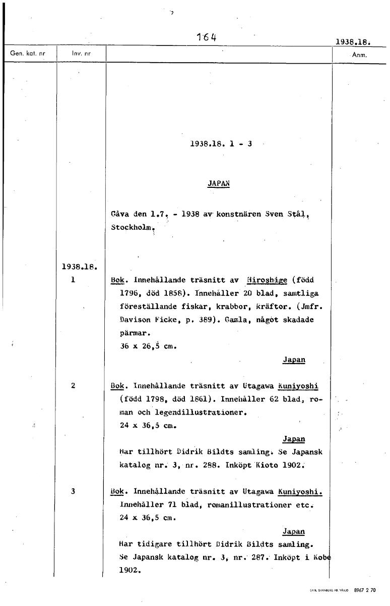 164 1938.18. 1938.18. 1 - 3 JAPAN Gåva den 1.7. - 1938 av. konstnären Sven Stål, Stockholm. 1938.18. 1 Bok. Innehållande träsnitt av Hiroshige (född 1796, död 1858). Innehåller 20 blad, samtliga föreställande fiskar, krabbor, kräftor. (Jmfr. Davison Ficke, p. 389). Gamla, något skadade pärmar. 36 x 26,5 cm. Japan 2 Bok. Innehållande träsnitt av Utagawa Kuniyoshi (född 1798, död 1861). Innehåller 62 bladå ro- man och legendillustrationer. 24 x 36,5 cm. Japan tiar tillhört Ridrik Bildts samling: Se Japansk katalog nr. 3, nr. 288. Inköpt Kioto 1902. 3 Bok. Innehållande träsnitt av Utagawa Kuniyoshi. Innehåller 71 blad romanillustrationer etc. 24 x 36,5 cm. Japan Har tidigare tillhört Ridrik Bildts samling. Se Japansk katalog nr. 3, nr. 287. Inköpt i Kob 1902. [ocr]