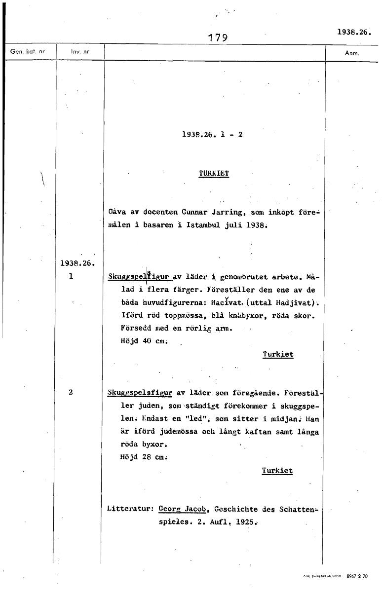 1938.26. 179 1938.26. 1 - 2 TURKIET Gåva av docenten Gunnar Jarring, som inköpt före målen i basaren i Istambul juli 1938. 1938.26. 1 Skuggspe figur av läder i genombrutet arbete. Må- lad i flera färg...Visa hela