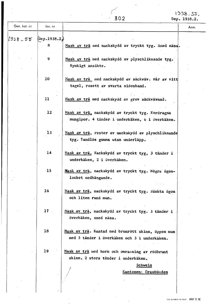 t 251a . 3 0.2 Dep. 1938.2. t93 Dep.1938.2 8 ask av trä med nackskydd av tryckt tyg. Sned näs 9 Mask av trä med nackskydd av plyschliknande tyg. Rynkigt ansikte. 10 Mask av trä med nackskydd av säckvä...