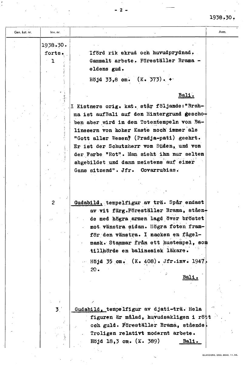 1938.30. 1938.30. forts. Iförd rik skrud och huvudprydnad. 1 Gammalt arbete. Föreställer Brama eldens gud. Böjd 33,8 cm: K. 373). Bali . 1 Kiatners orig kat._ står följande:"Brah,-, ma ist aufBali auf den Hintergrund gescho ben aber wird in den Totentempeln von 3a- linesern von hoher Kastig nock imMer'ala "Gott aller Wesen, (Pradja-pati) geehrt. Er ist der Schutzherr vom Stiden,, und von deryarbe: "Rot". Man siebt ihn nur selten abgebildet vild dann meistens'Auf'einer Gans sitzend". Jfr. Covarrubias. 2 Gudabildfutempelfigur.av trä. Spår endast av vit färg.FöreStäller Brama, ståen de med ogra,armen'lgul,över bröstet mot vänstra sidan. Högra foten: fram- förtiden vänstra. 1 nacken en fågel- mask.. Stammar från ett hustempel, so tillhörde en balinesisk läkare. Höjd 35 ,cm. (K. 408). Jfr.inv. 1947. 20. • Bali. Gudabild, tempelfigur av djati-trä. Hela figuren är målad,. hUVudsakligen 1 rö t och guld. Föreställer Branta, stående Troligen relativt modernt arbete. Höjd 18,3 OM. (K. 389) [ocr]