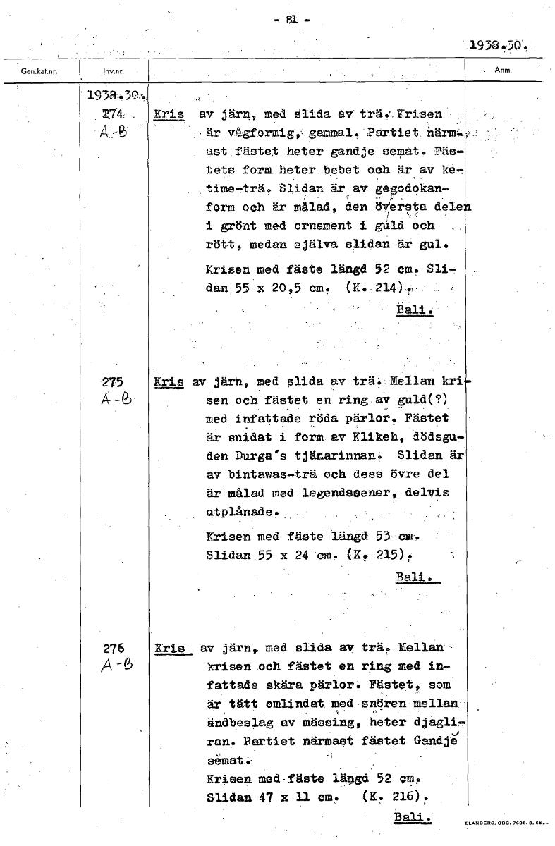 81 1933.30 1933.3N 274 Kris av järn, med slida av' trä.'. Krisen är vågformig,, gammal. Partiet närma. ast fästet heter gandje servat . Täs- tets form heter betet och är av ke- , time—trä. Slidan är av gegodokan-® form och är målad, den översta dele i grönt med ornament i Båld och rött, medan själva slidan är gul. Krisen med fäste längd 52 cm. Slå- dan 55 x 20,5 cm. (K.,214). Bali. 275 Kris av järn, med slida av trä«Mellan kri 4-6 sen och fästet en ring av guld(?) red infattade röda pärlor. Fästet är snidat i form av Klikeh, dödsgu- den Durga's tjänarinnan. Slidan är av bintawas—trä och dess övre del är målad med legendscener, delvis utplånade. Krisen med fäste längd 53 cm. Slidan 55 x 24 cm. (14 215). Bali. 276 Kris av järn, med slida av trä. Mellan A -6 krisen och fästet en ring med in- fattade skära pärlor. Fästet, som är tätt omlindat med snören mellan ändbeslag av mässing, heter djagli- ran. Partiet närmast fästet Gandje semat:- Krisen med fäste längd 52 am. Slidan 47 x 11 cm. (K. 216). Bali. [ocr]